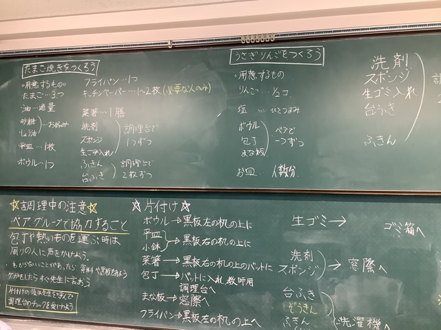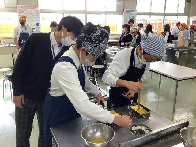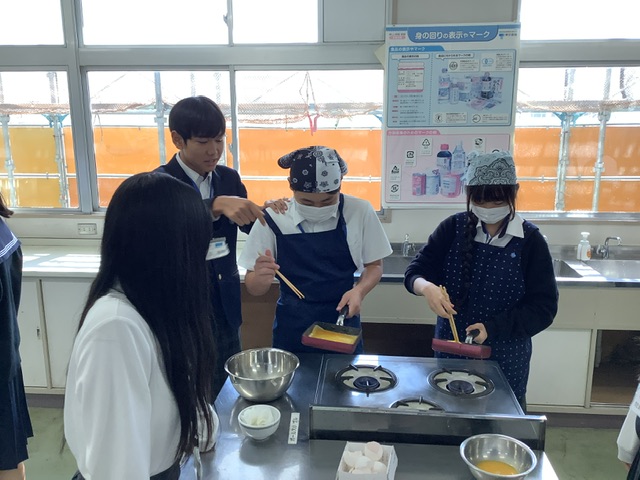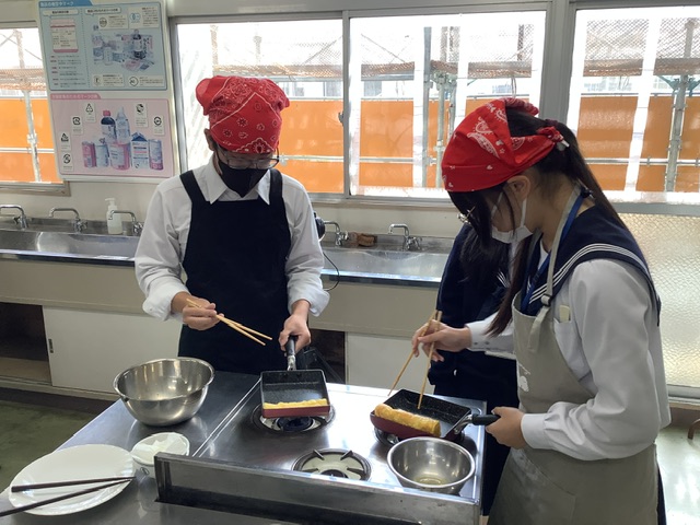 3年生の家庭科です。一人一人、卵焼きに挑戦です。卵の固まり具合を見ながら巻いていきます。家でも実践できそうですね。