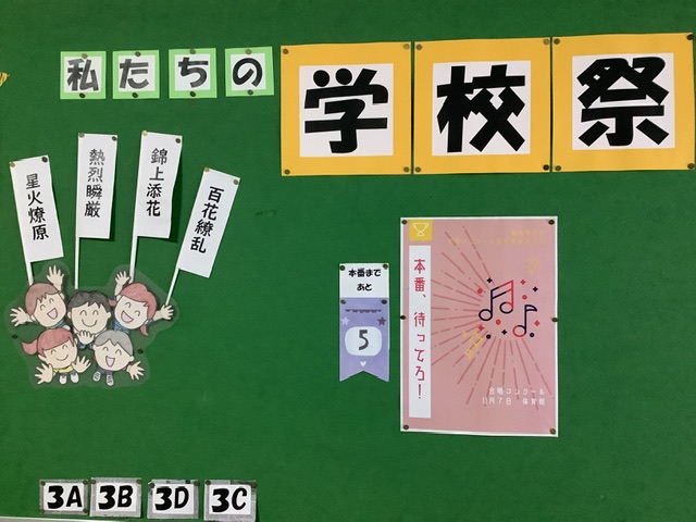 いよいよ今週末に、高根祭文化祭の部、合唱コンクールが行われます。三年生の廊下、掲示板にはコンクールのポスターとメッセージが掲示されています。