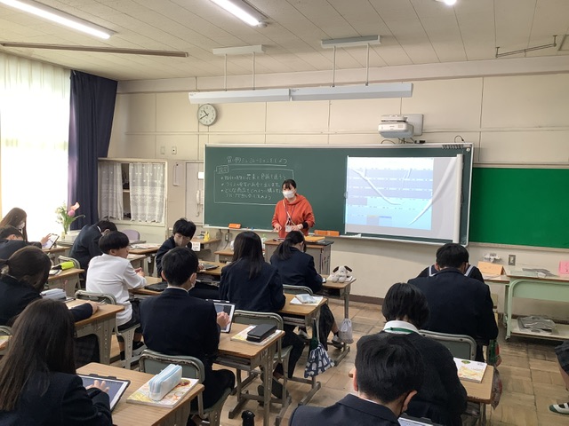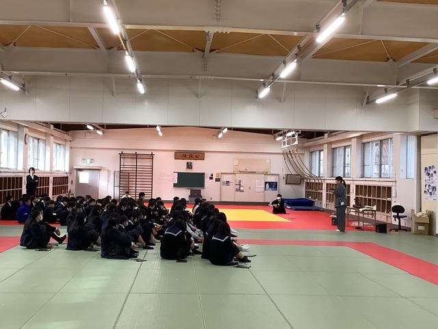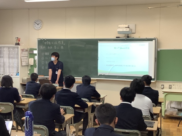12月15日に、がんに関する学習を行いました。知多半島総合医療センターの医師、看護士の方をお招きしました。毎年、二年生を対象に実施しています。かんの現状や治療方法、予防などについてお話しいただきました。若い年代のうちに、生活習慣を見つめることの大切さを学びました。