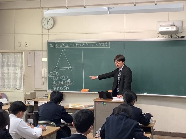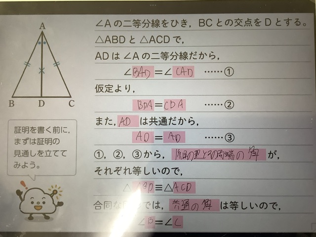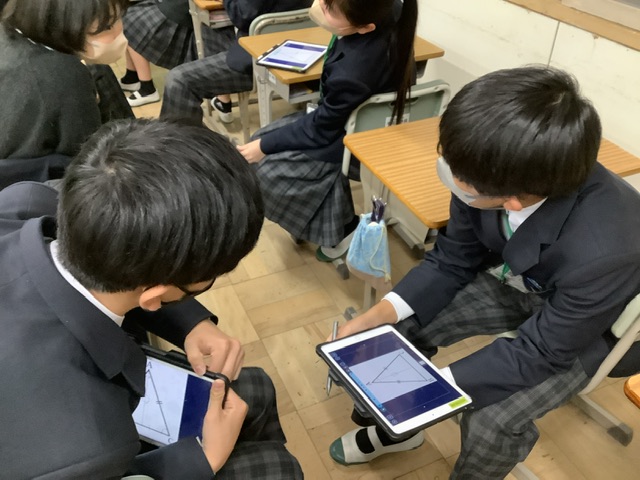 二年生の数学です。図形の学習に入りました。相似の条件確認したり、相似の図形を見つけ出したりしていきます。自分の言葉で説明する時間を最後に取りました。