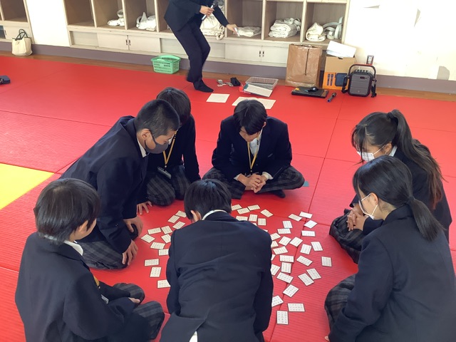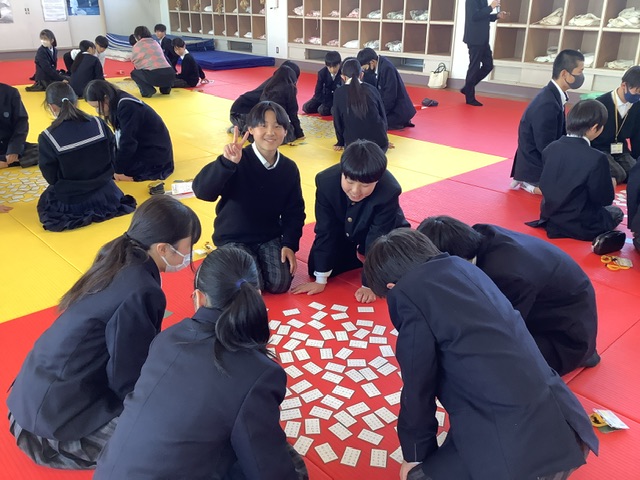 一年生が百人一首大会を行いました。頭を突き合わせての真剣な勝負です。クラス対抗と個人戦、楽しくにぎやかな会場です。